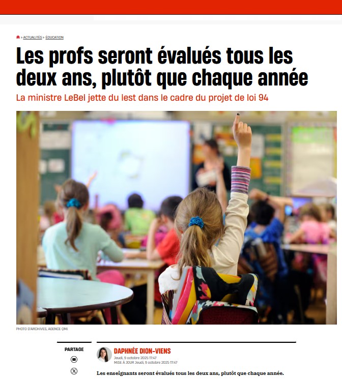 «Pour leur part, les syndicats d’enseignants auraient préféré que l’évaluation obligatoire soit abandonnée ou à tout le moins réalisée tous les cinq ans, mais ils saluent tout de même le changement.