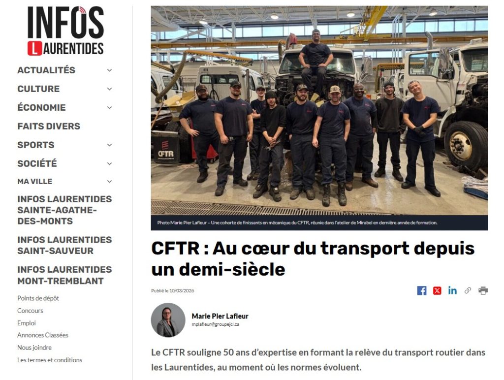 «Le Centre de formation du transport routier (CFTR) de Saint-Jérôme marque cette année un demi-siècle d’activité. Maison mère d’un réseau couvrant tout l’ouest du Québec, l’établissement administre l’ensemble de ses programmes depuis Mirabel, où se trouvent aussi la majorité des équipements et des équipes pédagogiques. Le centre compte 125 enseignants, dont une douzaine en mécanique de véhicules lourds routiers, et dessert plusieurs points de service, notamment Mont-Laurier, Gatineau, Joliette et la région métropolitaine. Partout, la formation demeure uniforme et encadrée par les mêmes standards, ce qui permet aux élèves d’obtenir les mêmes compétences, peu importe le lieu où ils suivent leur DEP.»