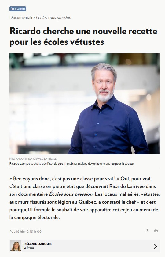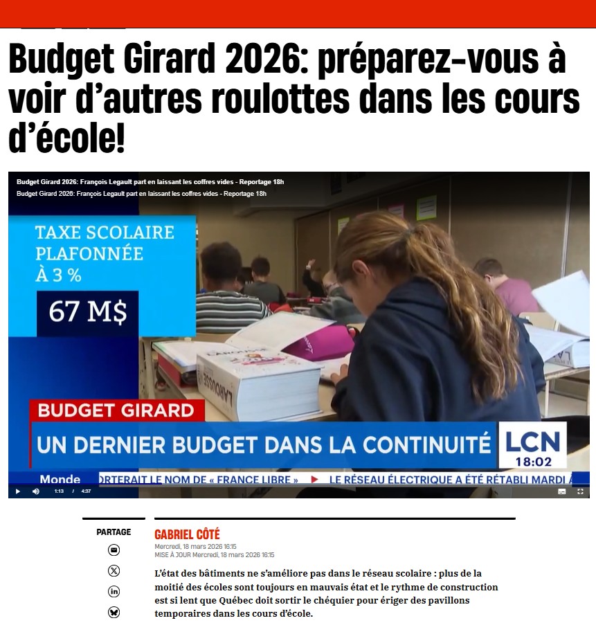 «Le portrait que celui-ci dresse de la vétusté des écoles québécoises s’avère toutefois accablant : 57 % des écoles primaires et 61 % des écoles secondaires se trouvent aujourd’hui dans un mauvais ou dans un très mauvais état. Une hausse respective de 13 et de 34 points de pourcentage par rapport au dernier budget signé par les troupes libérales de Philippe Couillard, en 2017-2018.»