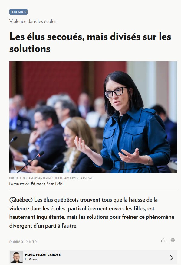 «Les élus québécois trouvent tous que la hausse de la violence dans les écoles, particulièrement envers les filles, est hautement inquiétante, mais les solutions pour freiner ce phénomène divergent d’un parti à l’autre.»