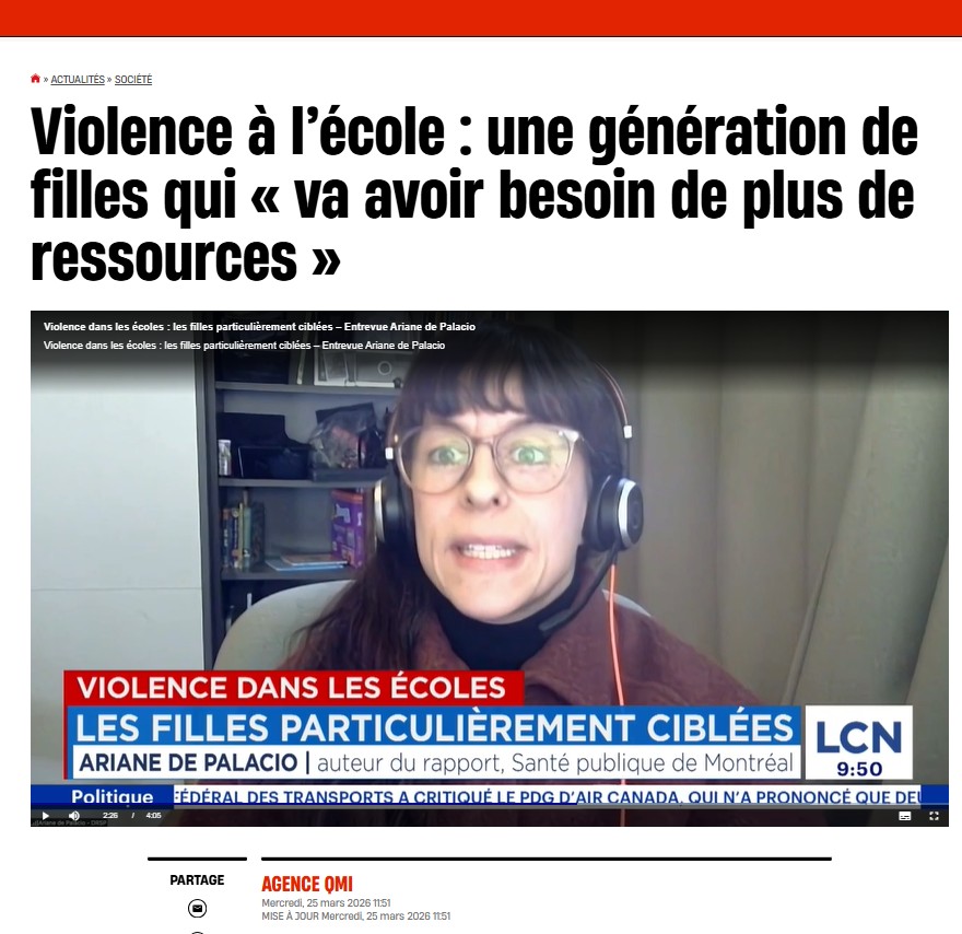 «Les données de l’Enquête québécoise sur la santé des jeunes du secondaire (EQSJS) montrent que la proportion de jeunes qui ont affirmé vivre au moins une forme de violence est passée de 36 % en 2016-2017 à 41 % en 2022-2023.