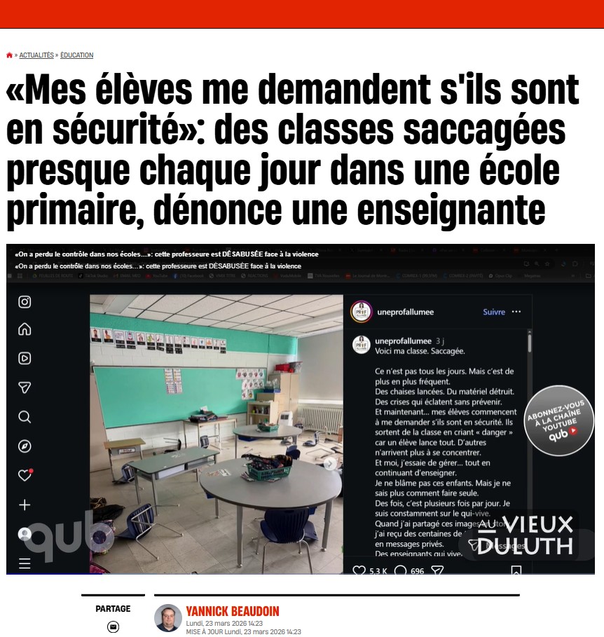 «Deux ans après avoir été victime d’une tentative de meurtre en classe, un enseignant déplore le manque de transparence des institutions scolaires. S’il avait su que l’élève qui l’a poignardé au cœur s’était montré violent avec une consœur avant d’être transféré à son école, Maxime Canuel aurait pu agir différemment en sa présence, croit-il aujourd’hui.»