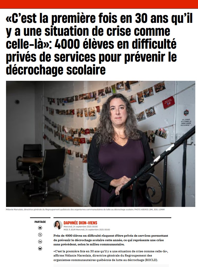 «Le portrait que brossent les membres de la Fédération des comités de parents du Québec (FCPQ) un mois après la rentrée scolaire est inquiétant. Dans plusieurs régions du Québec, dans des centres de services scolaires de petite et de grande taille, les parents engagés rapportent que les services aux élèves sont affectés par des compressions budgétaires et que des frais sont ajoutés aux parents.