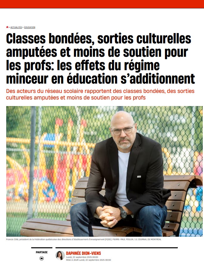 «Du côté des directions d’école, on confirme que le phénomène est «généralisé». Les activités parascolaires au secondaire ont été l’une des premières enveloppes budgétaires touchées en raison de l’effort budgétaire imposé par le gouvernement Legault, indique la Fédération québécoise des directions d’établissement d’enseignement.»