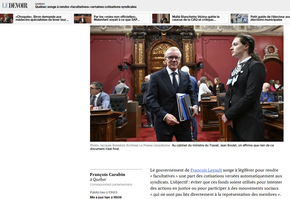«Des drapeaux rouges sont levés au sein même du ministère du Travail devant la réforme du régime syndical promise par François Legault. Des fonctionnaires recommandent au ministre Jean Boulet de ne pas aller de l’avant avec la cotisation « facultative », a appris La Presse.»