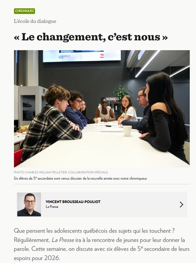 «Après une rentrée scolaire échevelée, l’année 2026 s’ouvrira-t-elle de façon plus zen ? C’est en tout cas le vœu de Sonia LeBel, qui se donne comme mission d’apaiser le réseau de l’éducation. Un réseau qui doit s’adapter à un nouveau tour de vis en matière de laïcité… en attendant le prochain. Le tout, sur fond de vouvoiement obligatoire.»