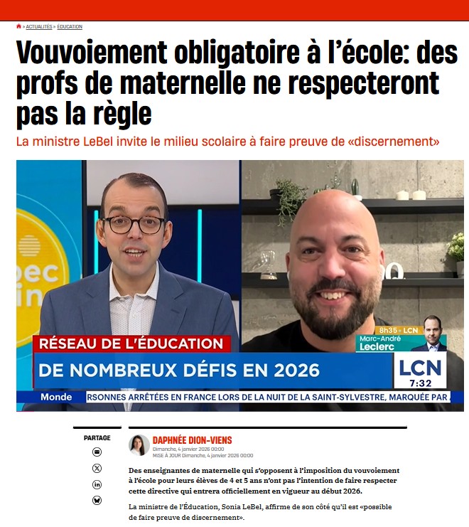«Des enseignantes de maternelle qui s’opposent à l’imposition du vouvoiement à l’école pour leurs élèves de 4 et 5 ans n’ont pas l’intention de faire respecter cette directive qui entrera officiellement en vigueur au début 2026. »