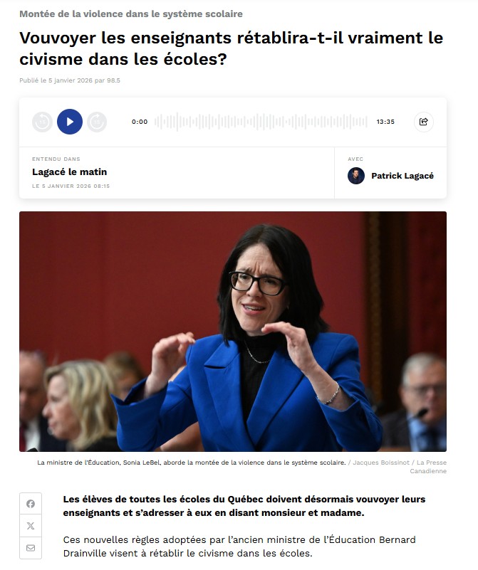 «Face aux critiques d’enseignants qui ne veulent pas obliger le vouvoiement aux enfants en prématernelle et maternelle, la ministre de l’Éducation, Sonia LeBel, souligne que ces règles de civisme ne sont pas nouvelles et invite les établissements à faire preuve de «discernement» dans son application. »
