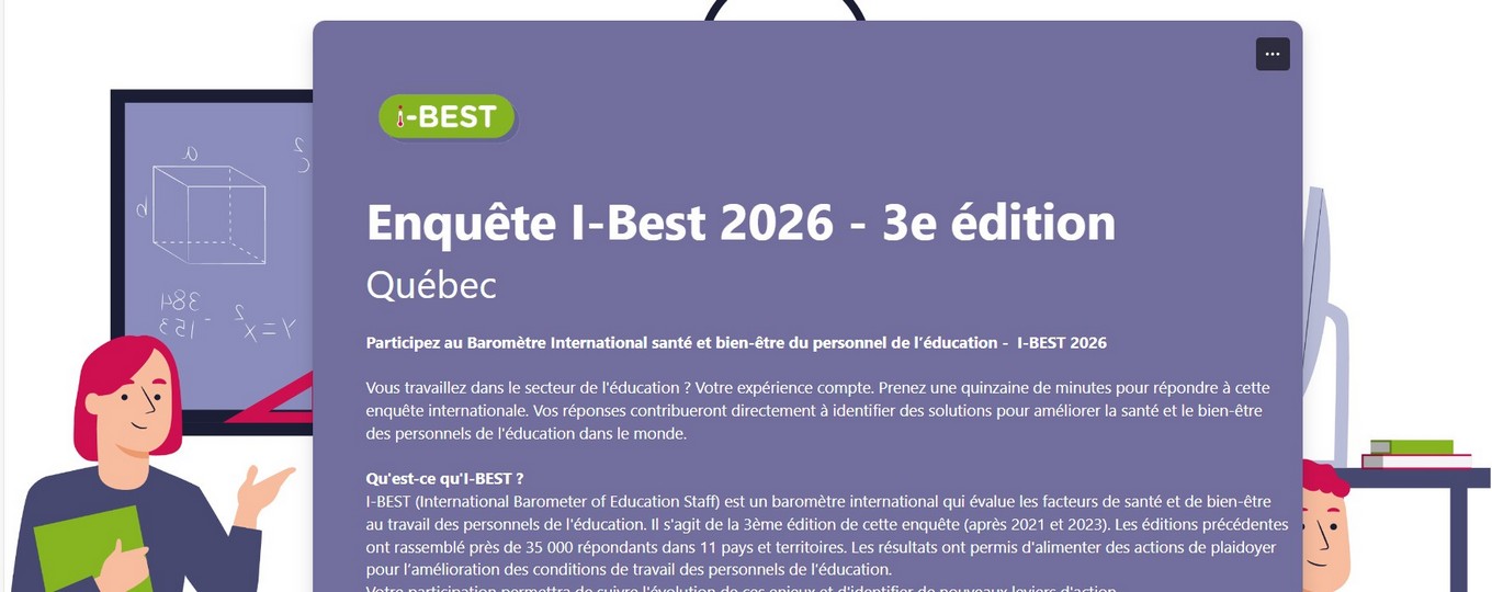 Participation à l’enquête internationale sur la santé et le bienêtre du personnel de l’éducation – IBEST