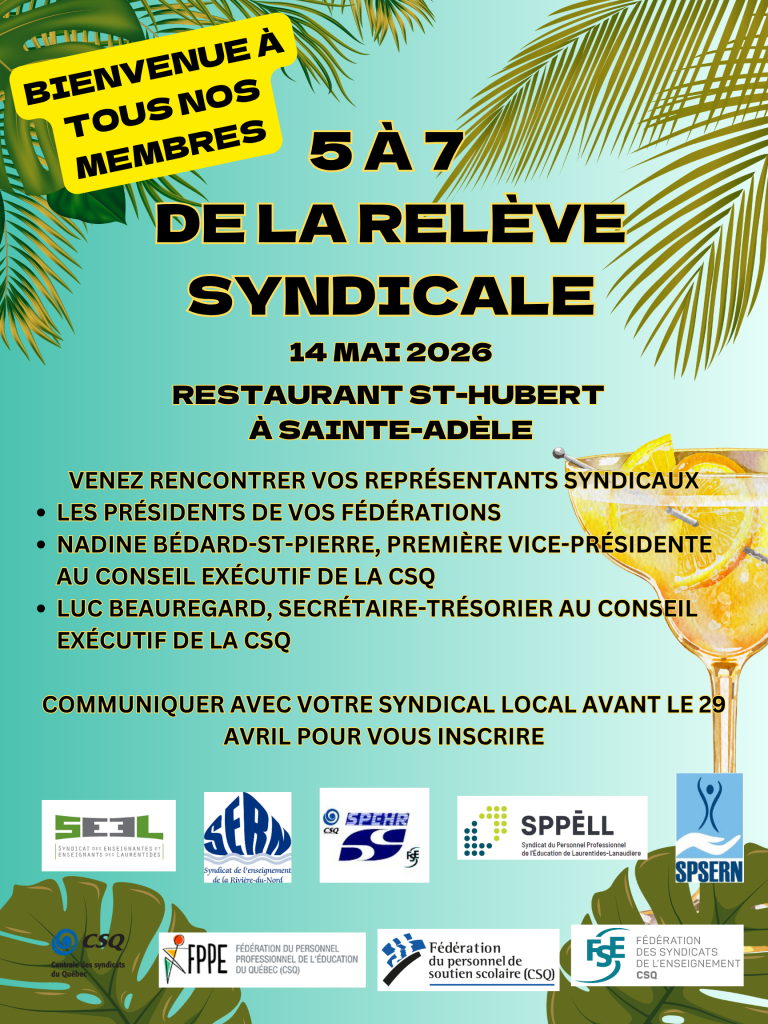 Afin d’encourager l’implication syndicale de nos membres et d’élargir notre réseau de contacts dans la région des Laurentides, cette invitation s’adresse aux nouvelles personnes impliquées syndicalement et à celles désirant s’impliquer.